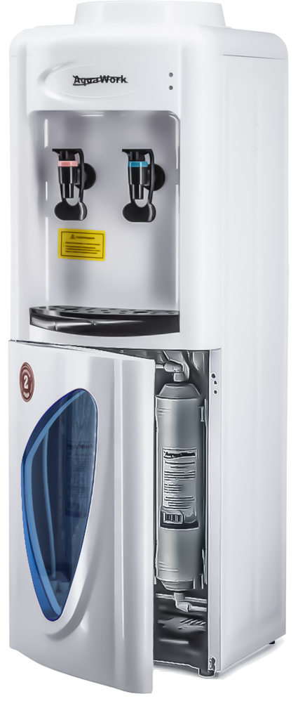 Миниатюрный напольный проточный кулер-пурифайер Aqua Work 0.7-LDR/SF+F с нагревом и системой электронного охлаждения воды. Очищает водопроводную воду при помощи 4-х ступенчатой системы UF-ультрафильтрации (фильтры размером 12-14 дюймов)